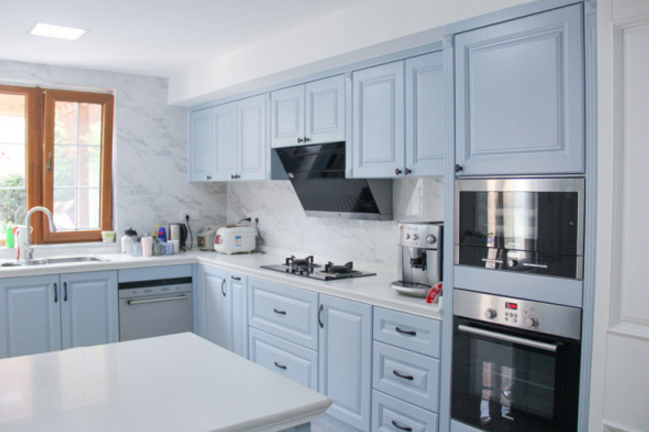 ▲淺籃色+白色搭配清新素雅,整個(gè)廚房風(fēng)格簡(jiǎn)約大氣,實(shí)木板材讓廚房生活體驗(yàn)更加精致健康。